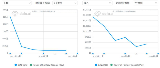 根据data.ai,从去年末上线至今,《幻塔》虽更新了多个版本,但下载与收入的总趋势下滑较为明显,目前尚无反弹迹象。由此来看,即使腾讯有“钞能力”,应该也很难凭借《幻塔》动摇《原神》的全球神话。