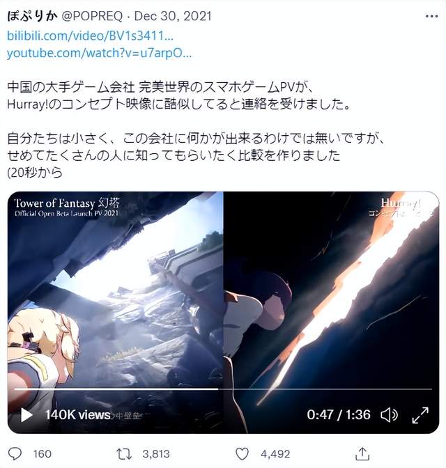 后又在公测后被日本动画团队"Hurray!"在Twitter上“公开处刑”。Hurray!称,有人告知他们《幻塔》PV与该团队制作的概念动画十分相似,Hurray!在确认过后制作并发布了对比视频为证。