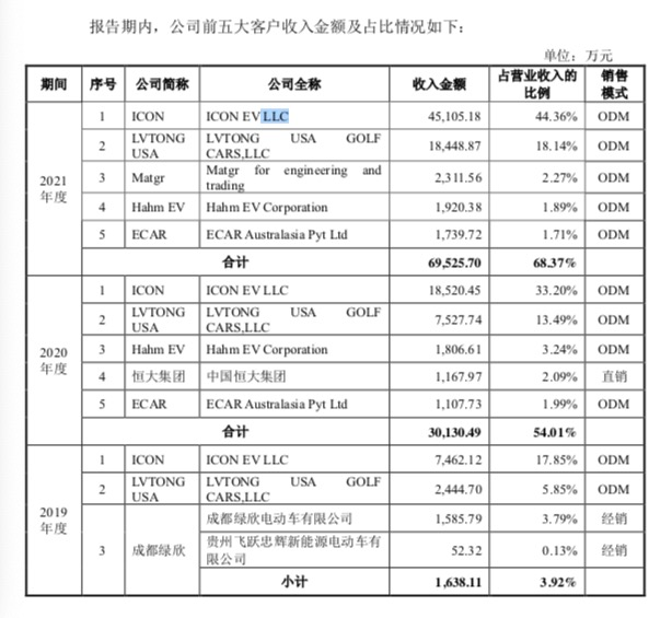 把注意力回转到业务本身,绿通科技的核心产品是高尔夫汽车。招股书显示,2019年-2021年,绿通科技的营业收入分别为4.18亿、5.58亿和10.17亿元,净利润分别为4853.56万元、5212.86万元和1.27亿元。