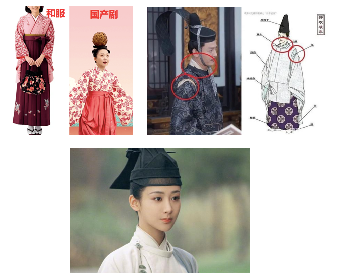 时间回到该剧播出初期(6月24日),早在微博、豆瓣等社交平台,就已有不少观众发出了“抵制”评论,并对其剧中妆造进行一一比对。比如女主刘金凤身穿的多款服装,造型、袖口和腋下,都明显与“和服”遥相呼应;剧中当朝宰相所带的乌纱帽,也被网友扒出名为日本平安时代大唐幞头的变种,名为垂缨冠,包括其在剧中穿的衣服,也与日本古代时期的“狩衣”较为吻合。