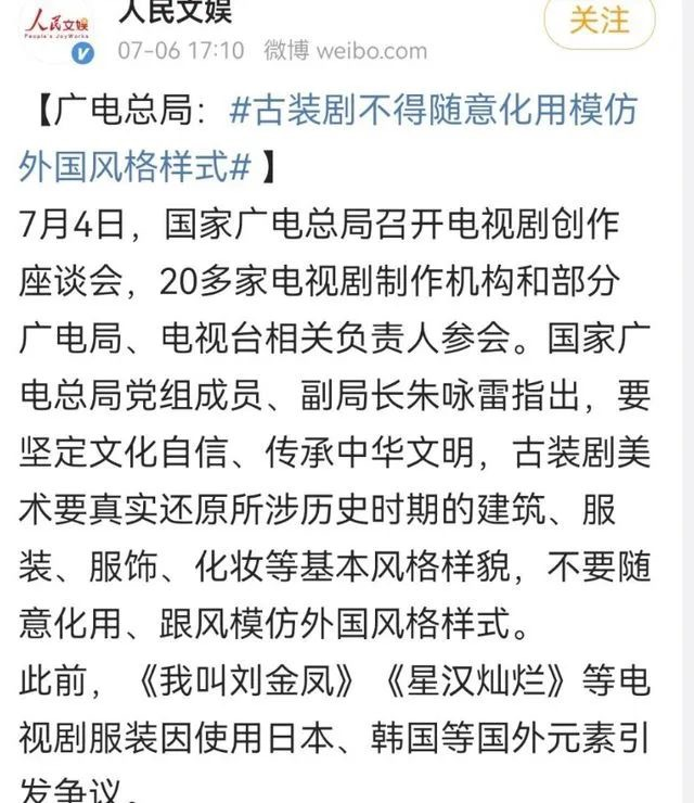 新政中明确提到,古装剧美术要真实还原所涉历史时期的建筑、服装、服饰、化妆等基本风格样貌,不要随意化用、跟风模仿外国风格样式;要坚持清新质朴、刚健有力的健康审美情趣,坚决抵制病态整容、“娘炮”审美、过度化妆、过度使用滤镜。这相当于在宏观层面上,今后的古装剧服化道乃至于审美情趣都将迎来一定“限制”。