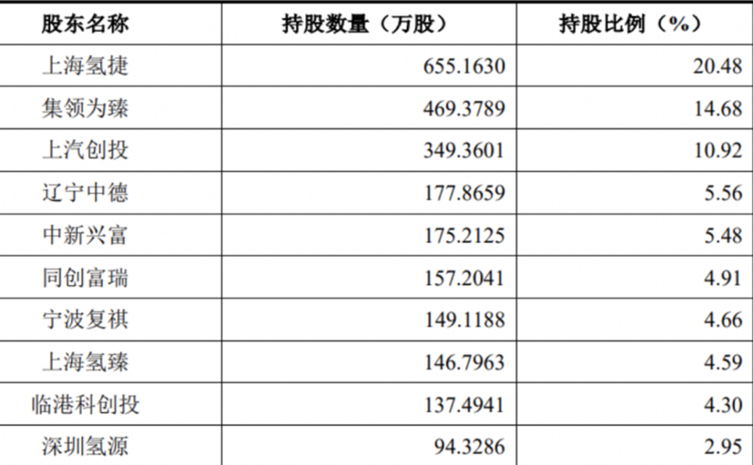 从公司提交的招股书看,前两大股东上海氢捷投资管理合伙企业(有限合伙)和上海集领为臻企业管理合伙企业(有限合伙)均为团队成员个人持股,而第三大股东上海上汽创业投资中心(有限合伙)属于产业投资人,其他股东有产业资本也有财务投资人。