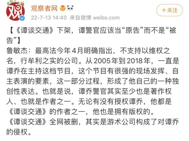 而《谭谈交通》的节目形式为谭乔走到街上找群众对话,本身不存在剧本和表演的成分,因此或许有被认定为“口述作品”的可能。两种不同的认定方式,也将极有可能影响到谭乔本人是否享有或部分享有该节目的著作权。
