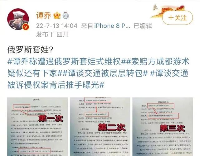 就在昨天,谭乔在微博中po出了三张图片,还带上了遭遇套娃式维权的微博tag。图片显示,此前曾向谭乔索赔的成都游术文化传播有限公司,将从成都广电手中拿到的《谭谈交通》相关权利二次授予了成都妹子文化传媒公司。该公司则如法炮制,将相关权利再度授予给北京析言知识产权代理有限公司。
