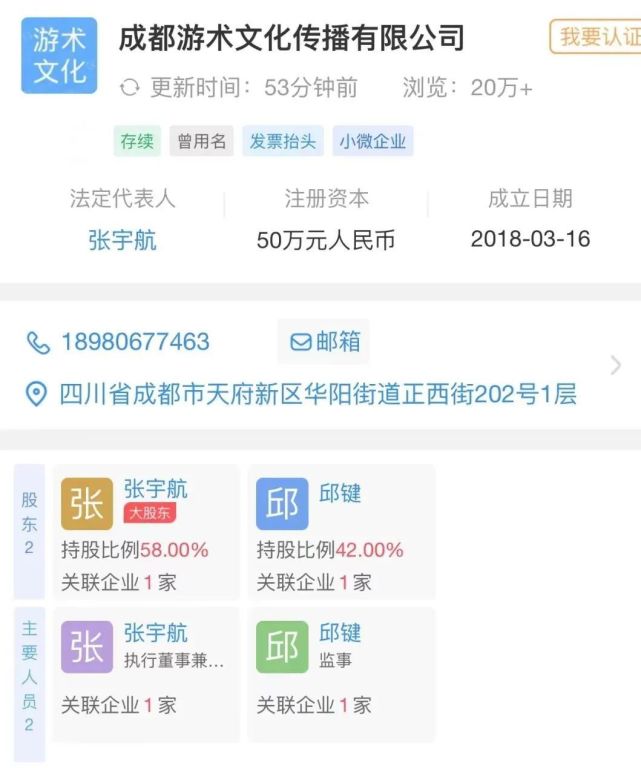 据企查查数据显示,成都游术文化传播有限公司注册于2018年3月16日,注册资本50万元人民币,持股人为张宇航和邱健,这俩人分别持股58%和42%,同时,这两位股东的关联企业仅有此一家。企查查还显示,该公司的实际参保人数为0人。