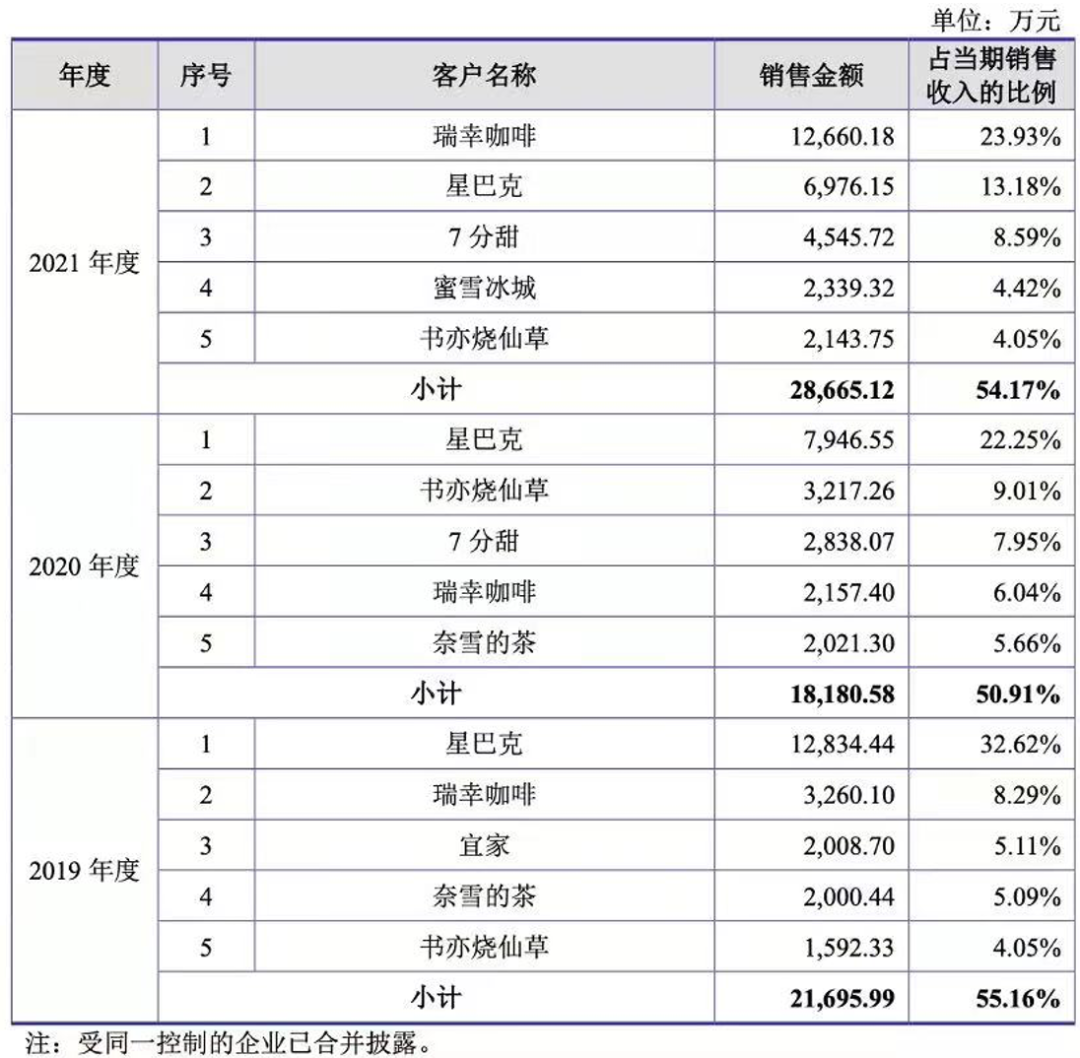 据招股书,2019年、2020年,星巴克都是德馨食品第一大客户。2021年,瑞幸咖啡超越星巴克,成为德馨食品第一大客户,星巴克退居第二。报告期内,瑞幸咖啡和星巴克,两家合计占当期销售收入的比例分别为40.91%、28.29%、37.11%。更准确地说,德馨食品是借着咖啡的风来到上市关口的。