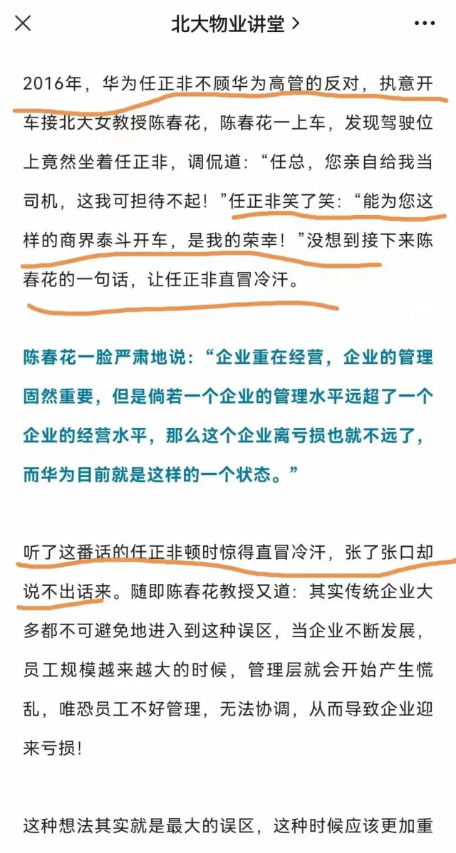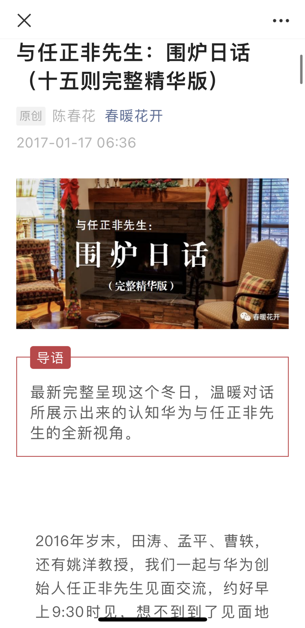 最早一篇就是流传度颇广的《与任正非先生:围炉日话》,这篇文章发布于2017年1月,文章里写了任正非亲自当司机,把陈春花引到会议室交谈的细节。这也是后来网络上出现一万多篇“陈春花做华为军师”文章的最初由来。