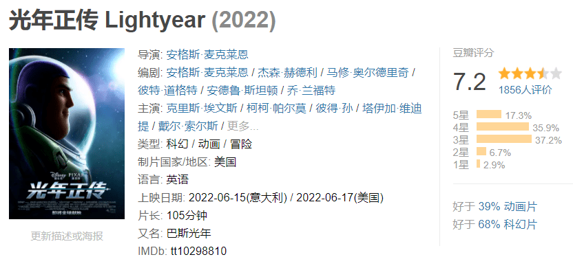同性的话题并不是杀死《光年正传》的全部,更多还得归结于内容端创作的坚实程度,这也是皮克斯近年来屡屡犯错的地方。目前北美烂番茄仅有区区75%,成为皮克斯近年来的新低,国内口碑方面,豆瓣仅有区区7.2分,同样也是低迷的数据。75%、7.2,这种梦工厂、照明级别的分数,不该出自皮克斯。