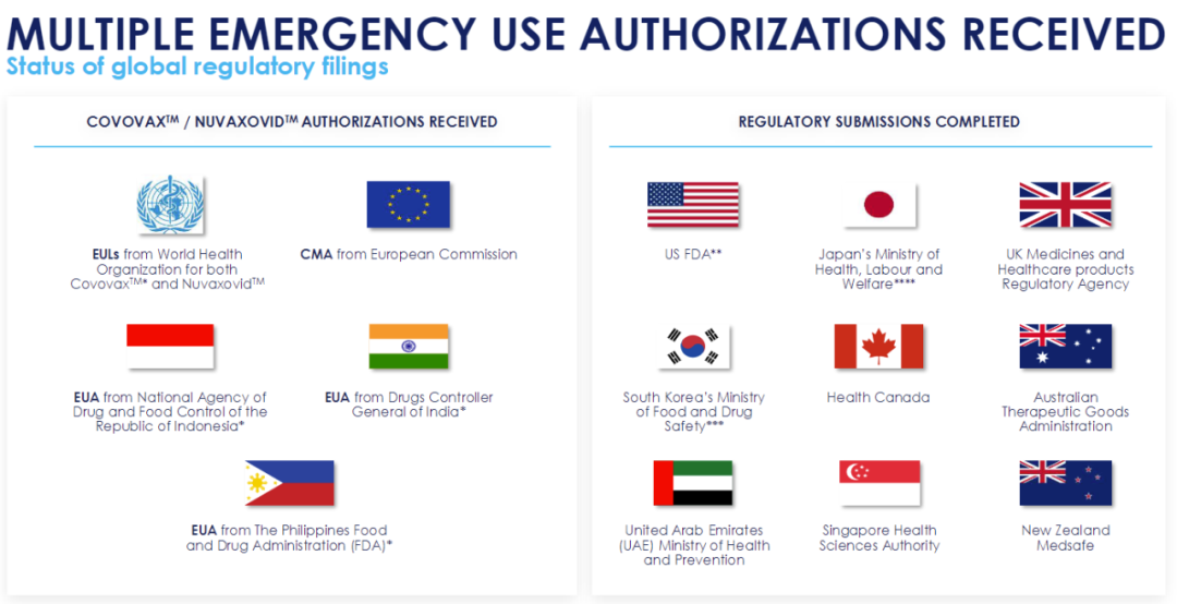 如此这般,Novavax错失了在2021年将NVX-CoV2373推向大规模上市的时机。直至2021年底,WHO才把Nuvaxovid纳入紧急使用清单(EUL),此后,英国、欧盟和澳大利亚等十几个国家和组织也对其放行——美国的“示好”最早还得在半年后。![]()