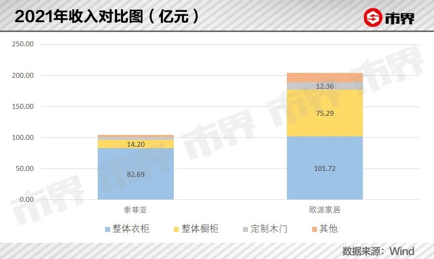 2021年,整体衣柜占索菲亚总收入的79%,其他包括厨柜、木门、地板等业务合计只有21.39亿元的营收。但欧派在衣柜业务之外,橱柜就有75亿元收入,其次是12亿元收入的木门业务和10亿元收入的卫浴业务,拼凑出来一个比索菲亚大得多的“蛋糕”。