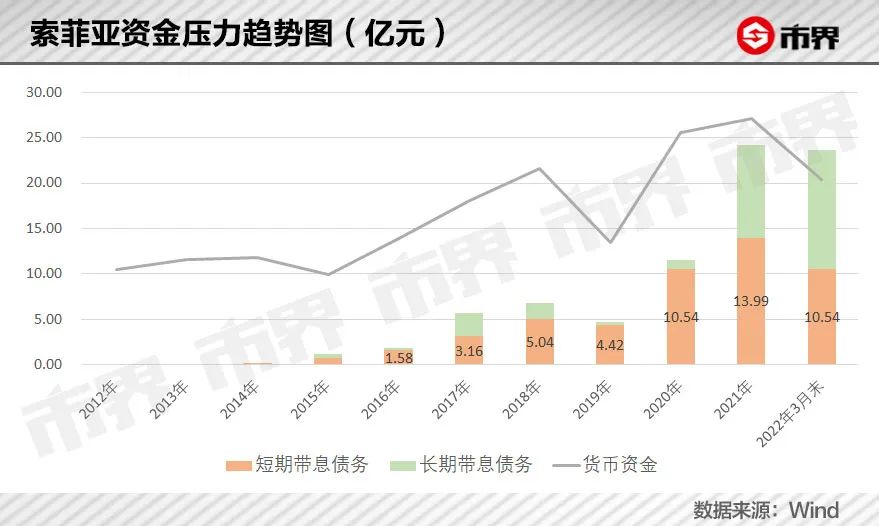 数据显示,2021年末索菲亚货币资金与其总额为24.16亿元的带息债务已经相当接近,2022年3月末,货币资金与短期带息债务之间只相差9.84亿元,而账上的合同负债(预收客户订单款项)则为9.43亿元。