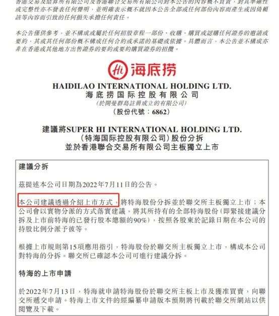 7月11日,海底捞发布公告称,正考虑将Super Hi International Holding Ltd.(以下简称“特海国际”)的股份以实物分派方式分拆,并以介绍上市方式于港交所主板单独上市。