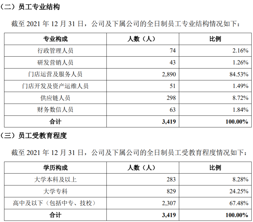 截至2021年12月31日,老娘舅拥有3,419名员工。其中研发营销人员43名,占比1.26%,核心技术人员为3人;学历方面,高中及以下(包括中专、技校)2,307人,占比67.48%。