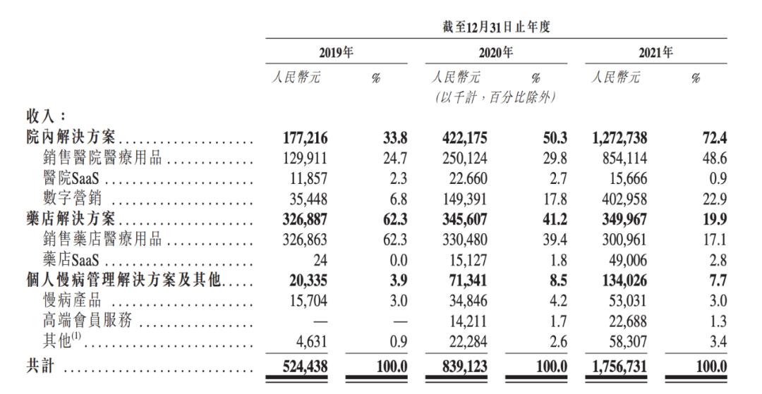 在院内解决方案、药店解决方案和个人慢病管理解决方案三大业务中,占比最高的并非是数字化管理,而是销售医疗用品获得收入,贡献了营收近七成。