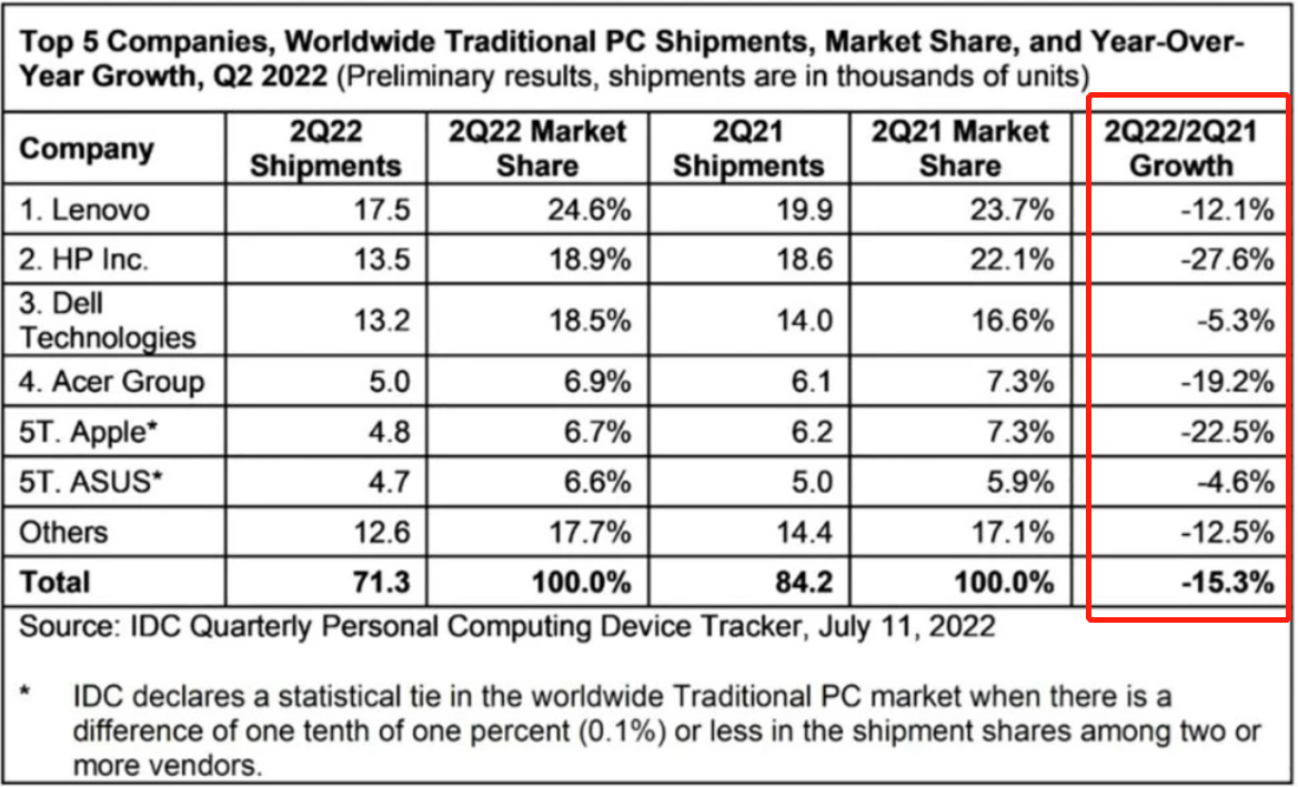 但从增速的角度看,这个数据可就太糟糕了——同比2021年二季度,出货量下滑了15.3%,上述五大厂商的出货量也全都出现同比下滑。其中跌幅最厉害的惠普和苹果,出货量同比都缩水超过20%。