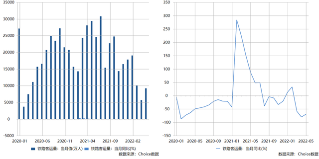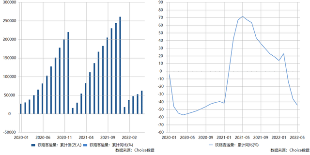 国家铁路局数据显示,2022年前5月全国铁路旅客发送量6.2亿人,同比下降44.6%,也低于疫情第一年2020年前五月6.5亿人的旅客发送量。