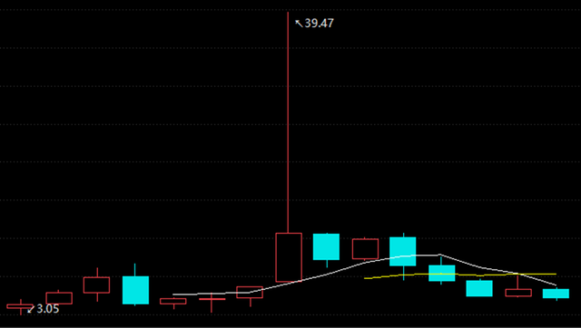 但涨幅瞬间即逝,股价在“615”牛市顶点之前就开始下跌,一路跌至8.35元低位,四个月左右时间跌去了75.6%。