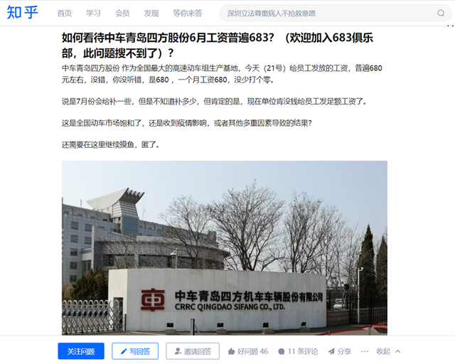 最近,有网友在知乎发文称:“中车青岛四方股份,作为全国最大的高速动车组生产基地,给员工发放的工资,一个月工资680,没少打个零。”