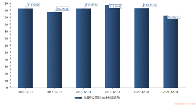 2021年,中国中车归母净利润为103亿,同比下跌9%,为南北车合并后最低。