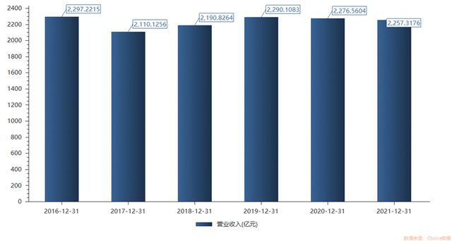 合并后的第一个完整会计年度2016年营业收入为2297亿元,此后多年均没有超过该数字,可谓出道即巅峰。