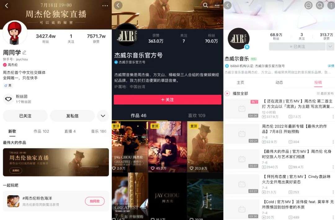 在平台方面,关于周杰伦的版权争夺一直以来热火朝天。据悉,2015年,周杰伦及其杰威尔音乐以850万的价格将版权授予网易云音乐后,在2018年授权费便涨至1818万;2018年,腾讯音乐更是高价拿下周杰伦的3年独家版权。而MV版权则在2020年授权给快手、抖音后,又于今年与B站达成战略合作,充分发挥了IP带动平台流量的影响力。