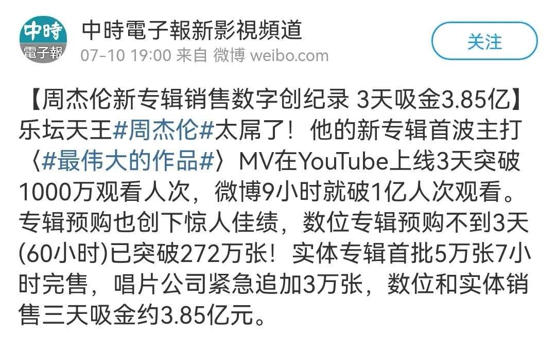 7天破亿,这个成绩在实体唱片时代也是超高销量。 实际上,早在7月8日凌晨0点开启预售后的第三天,周杰伦这张新专辑的实体版和数字版在两岸三地官方渠道的总预售额就已达到约3.85亿元。