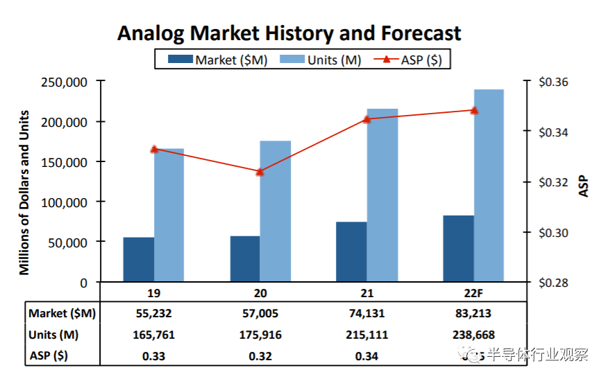 模拟芯片市场近年来销售额和出货量走势(图源:IC Insights)