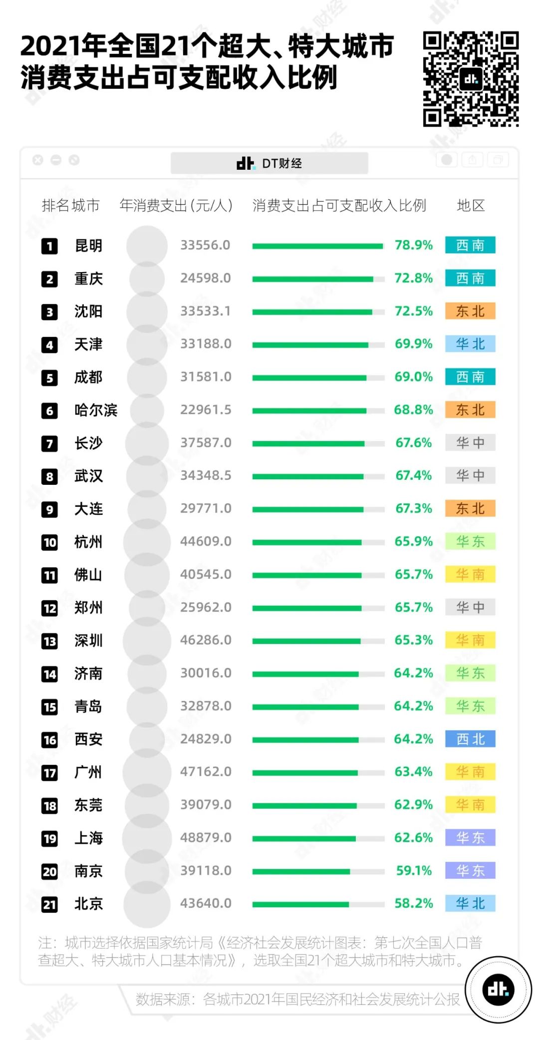 排名首位的昆明,消费支出占可支配收入的比例达到了78.9%,挣来的钱又大多都花出去了。