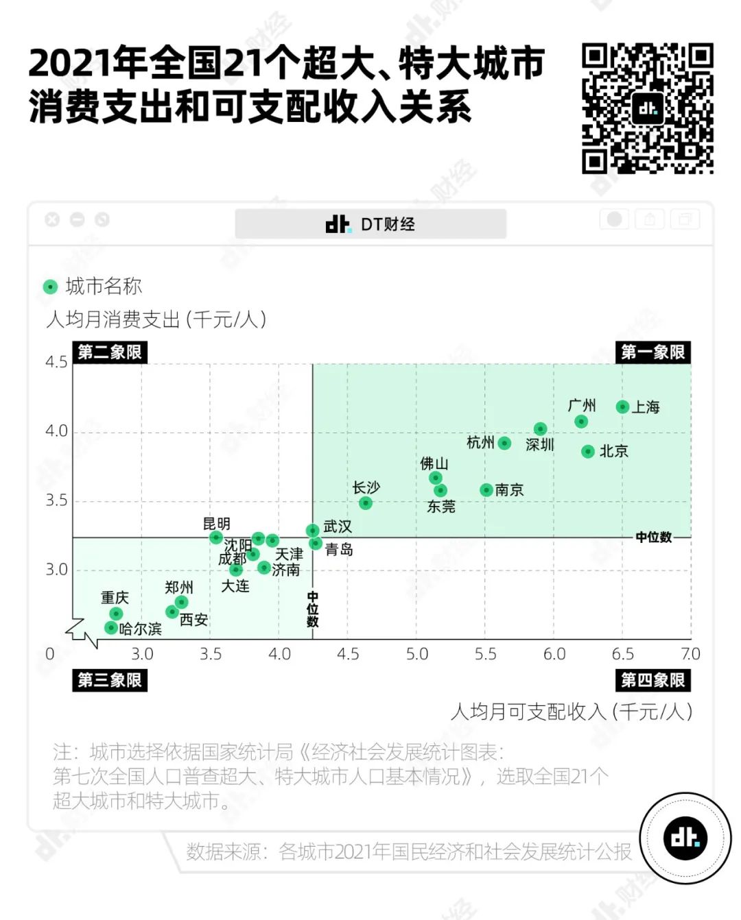我们把21座城市的人均可支配收入与人均消费支出放置在散点图上,并以中位数作为分割线,切出四个象限。整体来看,经济基础决定消费能力,城市居民的可支配收入越高,消费支出就越高。所以绝大多数城市都分布在第一(高收入高消费)和第三(低收入低消费)象限。