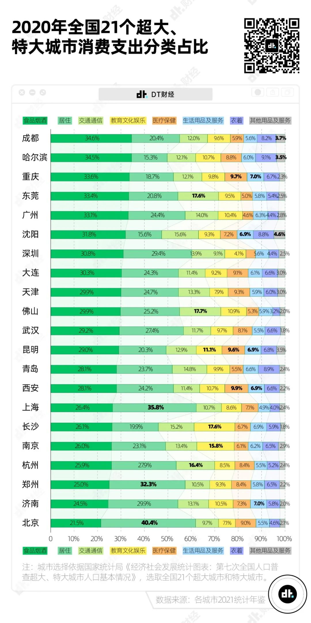 DT财经参照统计局数据,对城市的消费现状进行呈现和比较,希望通过数据来回答以下问题:哪些城市的居民消费水平更高?哪些城市的居民花钱更痛快?不同城市的居民,在消费账单的类目分配上有什么不同?