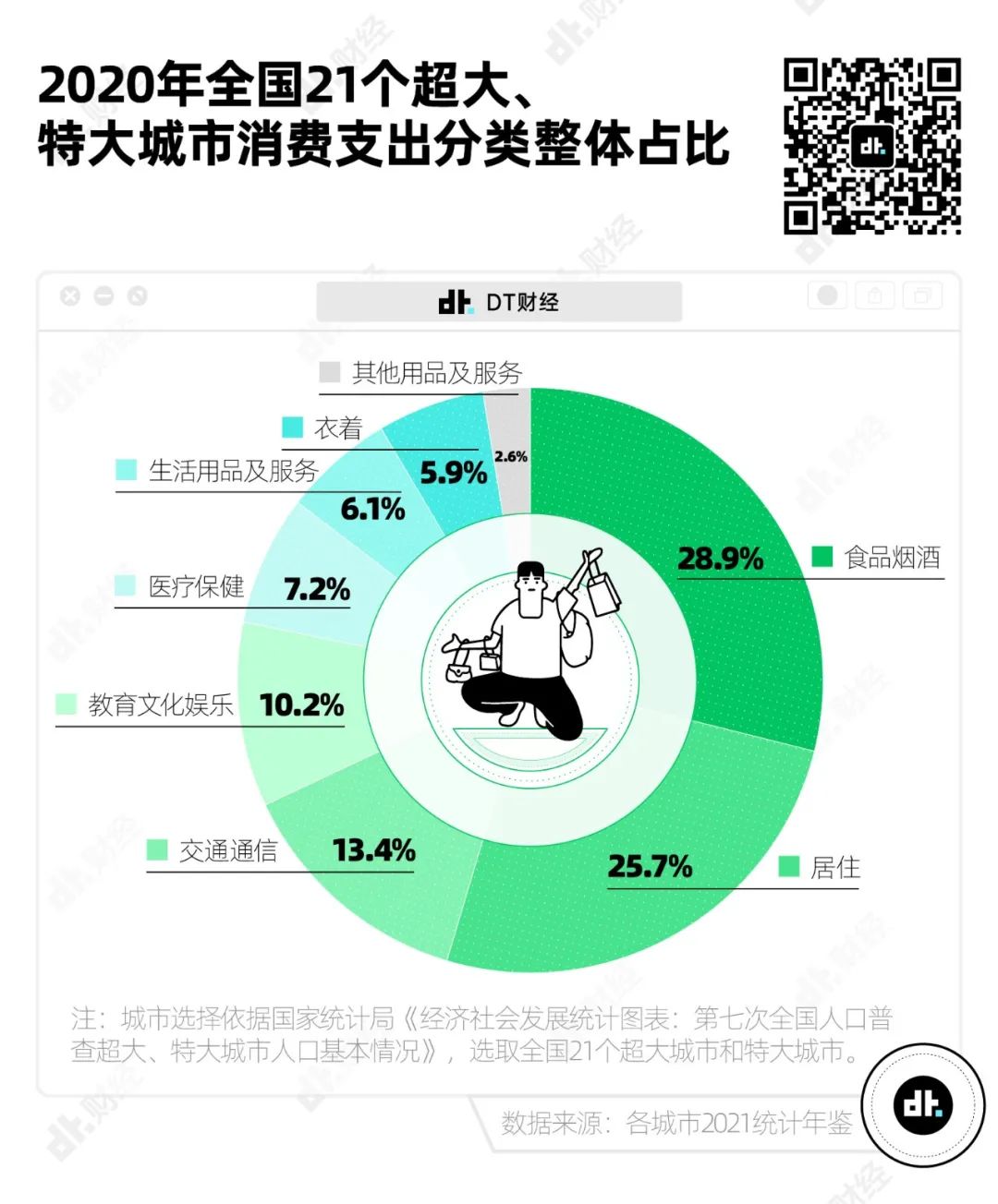 根据各城市的2021统计年鉴,2020年,21座城市居民主要把钱花在了食品烟酒(28.9%)和居住(25.7%)方面,其次是交通通信(13.4%)和教育文化娱乐(10.2%),花在生活用品及服务(6.1%)和衣着(5.9%)的比例较少。