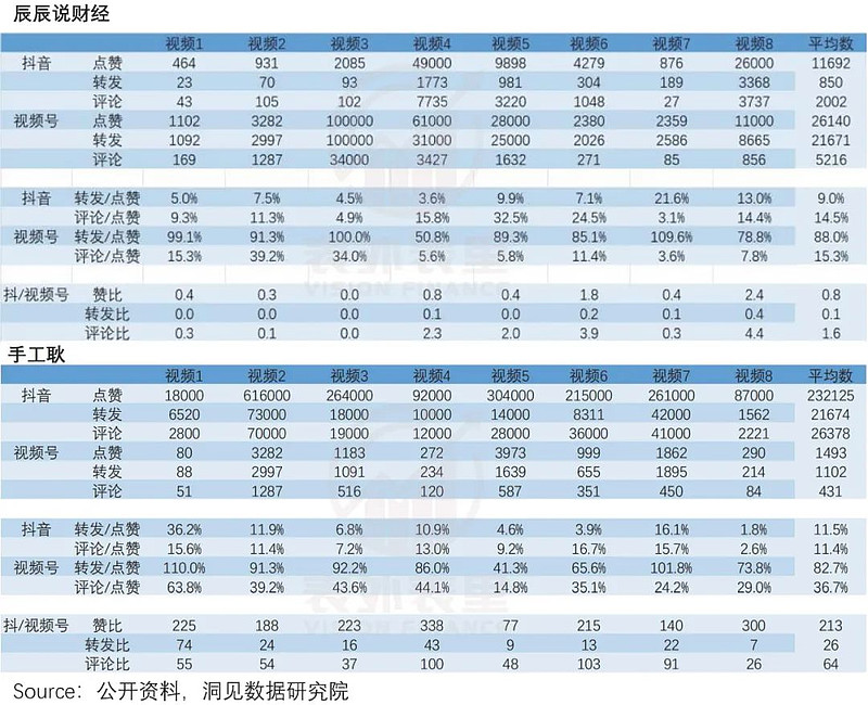 样本统计显示,泛知识类账号辰辰说财经,同样的内容,在视频号的点赞、评论量,远高于抖音;泛娱乐账号手工耿,同样的内容,抖音的点赞、评论要远超在视频号,但转发/点赞对比,视频号却高于抖音。