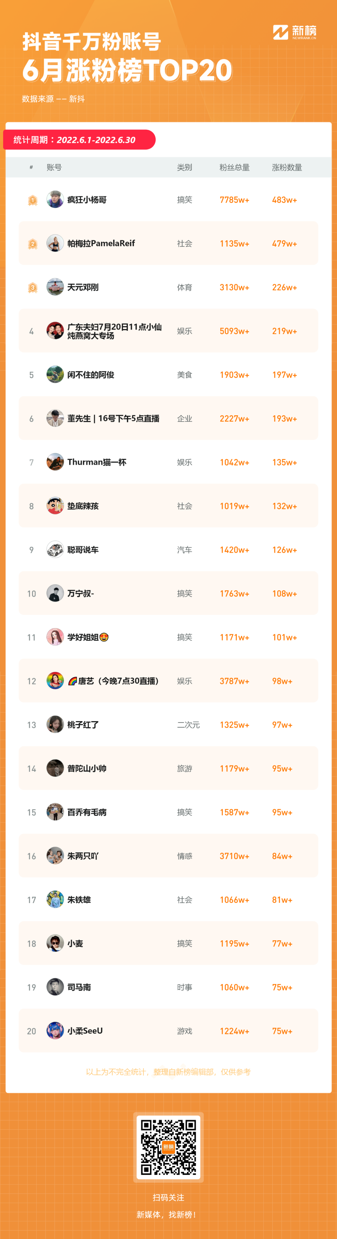 据新抖数据,截至6月30日,568个千万粉抖音账号中(除去政务媒体类账号的不完全统计),6月保持涨粉的有278个,占比48.9%。![]()
