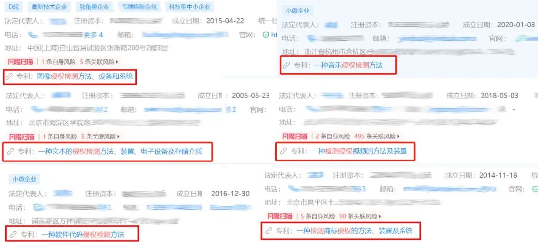 大规模的维权需要还催生了上游分门别类的全网检测生意,一些小型科技公司开发出了针对音乐、图像、视频、文本、软件代码等检测系统,并申请了专利。