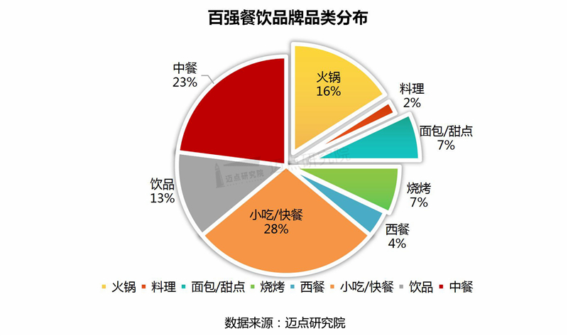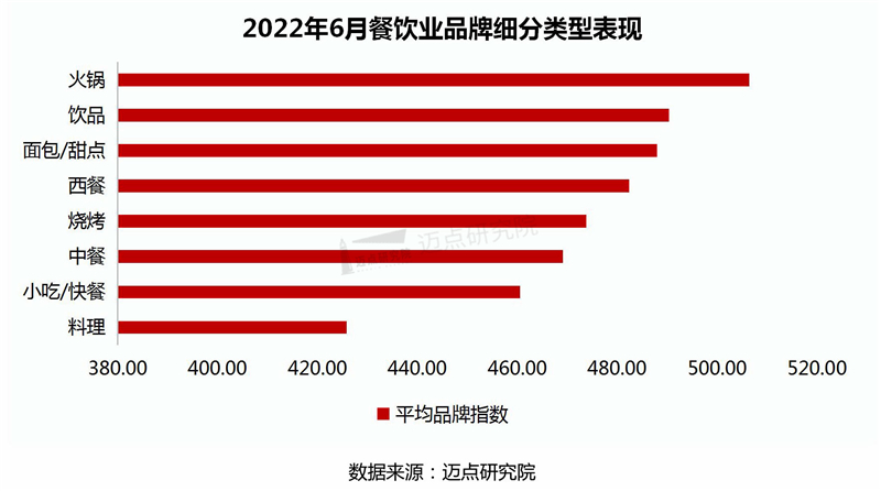 2022年6月餐饮业品牌影响力(MBI)100强品牌中,占比排名前三的品类分别是小吃/快餐、中餐和火锅,总占比超过67%;其次是饮品、面包/甜点、烧烤、西餐和料理等。