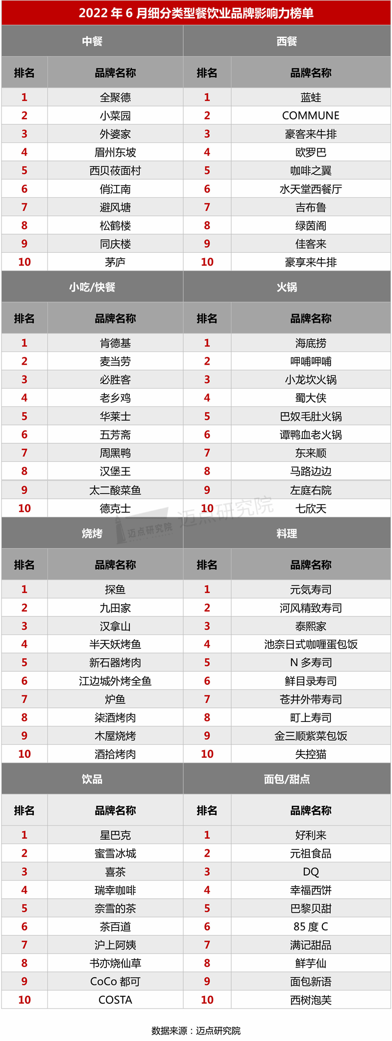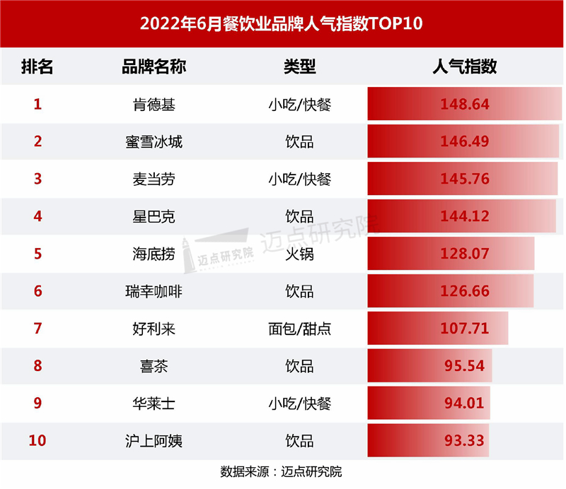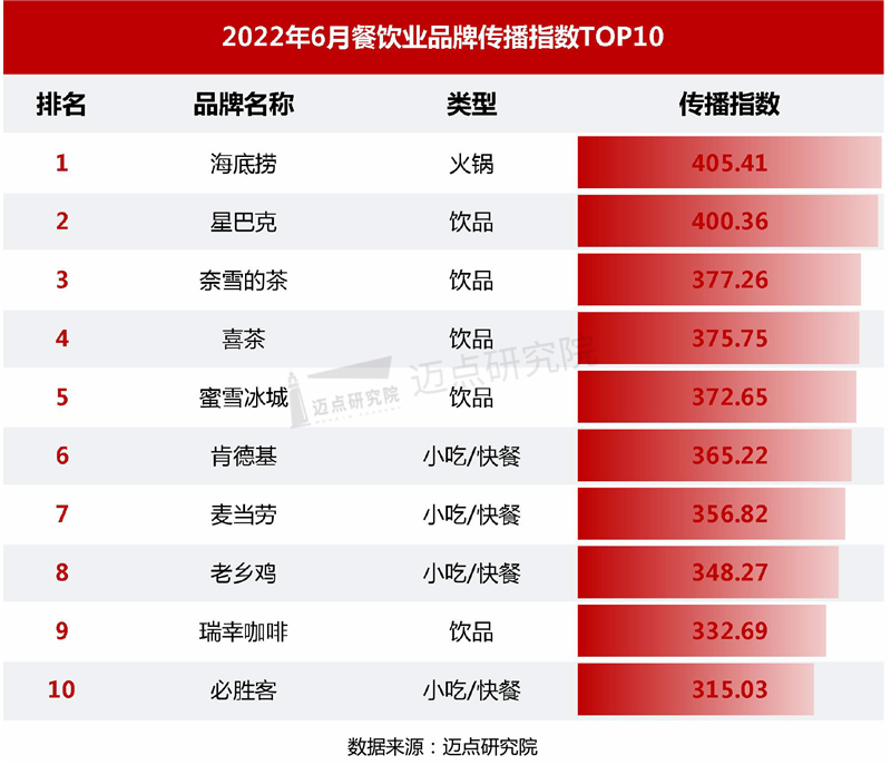 以下是迈点研究院独家发布的“2022年6月餐饮业品牌影响力(MBI)100强榜单”。本月海底捞 、星巴克、肯德基、麦当劳、蜜雪冰城、喜茶、瑞幸咖啡、奈雪的茶、必胜客、呷哺呷哺进入榜单前十。TOP10品牌中,饮品品牌热度最高,占5席;其次是小吃/快餐品牌占3席,而火锅品牌占2席。