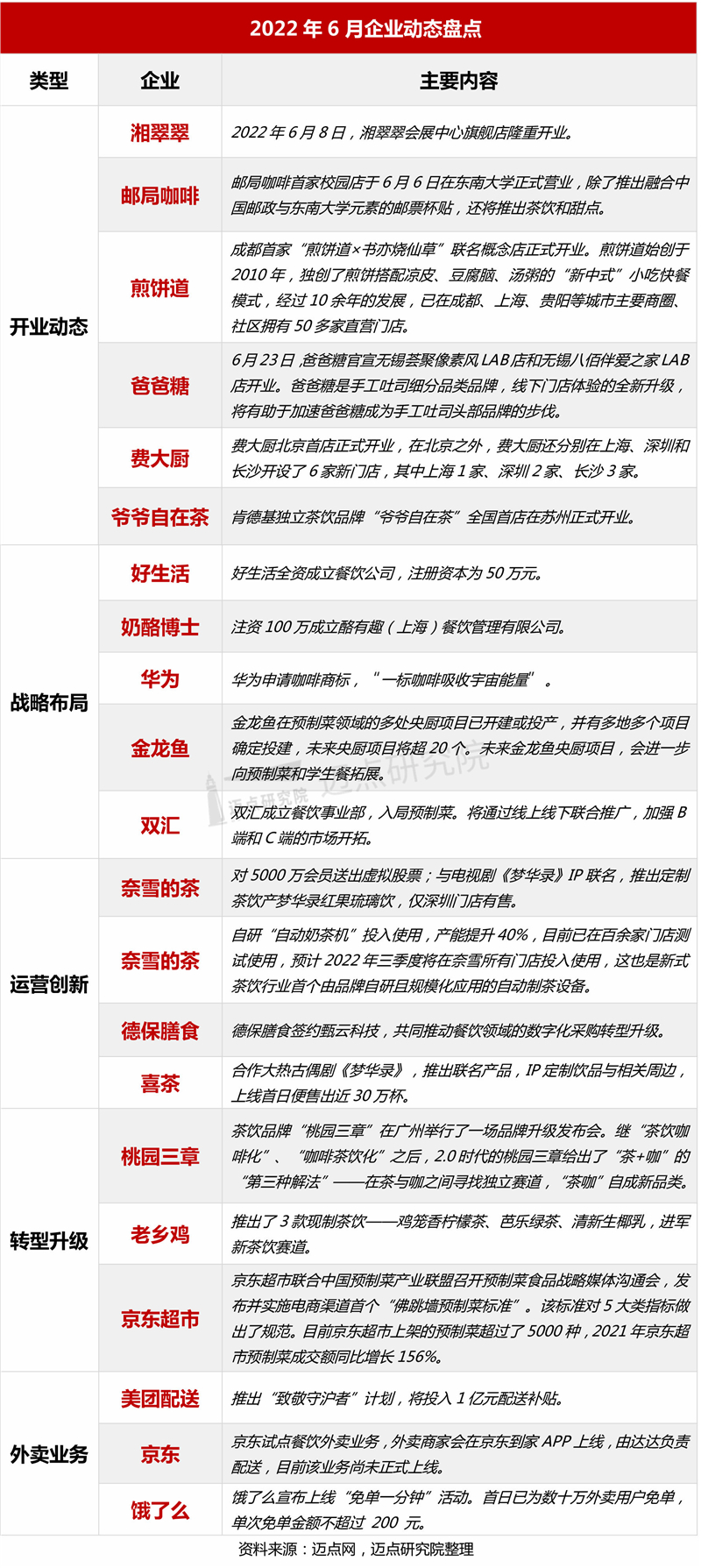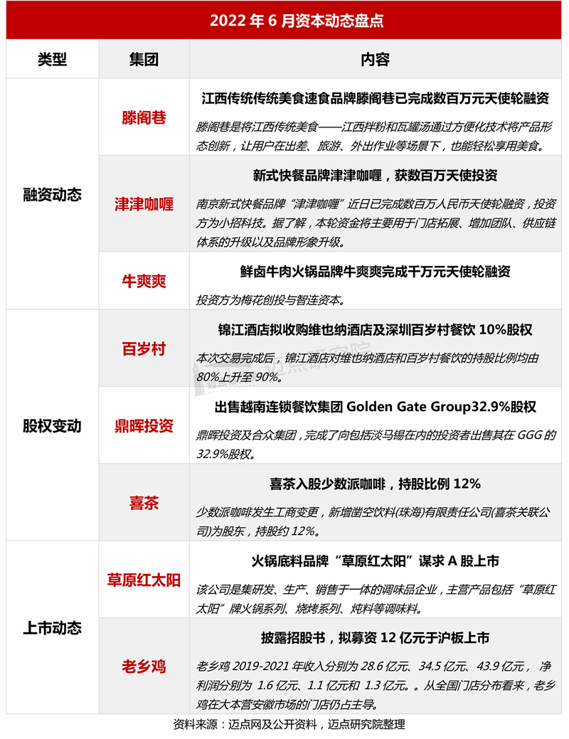 6月,融资方面,江西传统传统美食速食品牌“滕阁巷”、新式快餐品牌津津咖喱分别获数百万天使融资,另外,鲜卤牛肉火锅品牌牛爽爽完成千万元天使轮融资;上市方面,老乡鸡拟募资12亿元于沪板上市、火锅底料品牌“草原红太阳”谋求A股上市;另外,股权变动方面,百岁村餐饮、鼎晖投资和喜茶的相关股权迎来新变动,其中,喜茶投资少数派咖啡,持股约12%。目前茶饮市场趋于成熟,故部分头部茶饮品牌除了茶饮市场外,开始向咖啡等领域注资,寻求多元化发展。