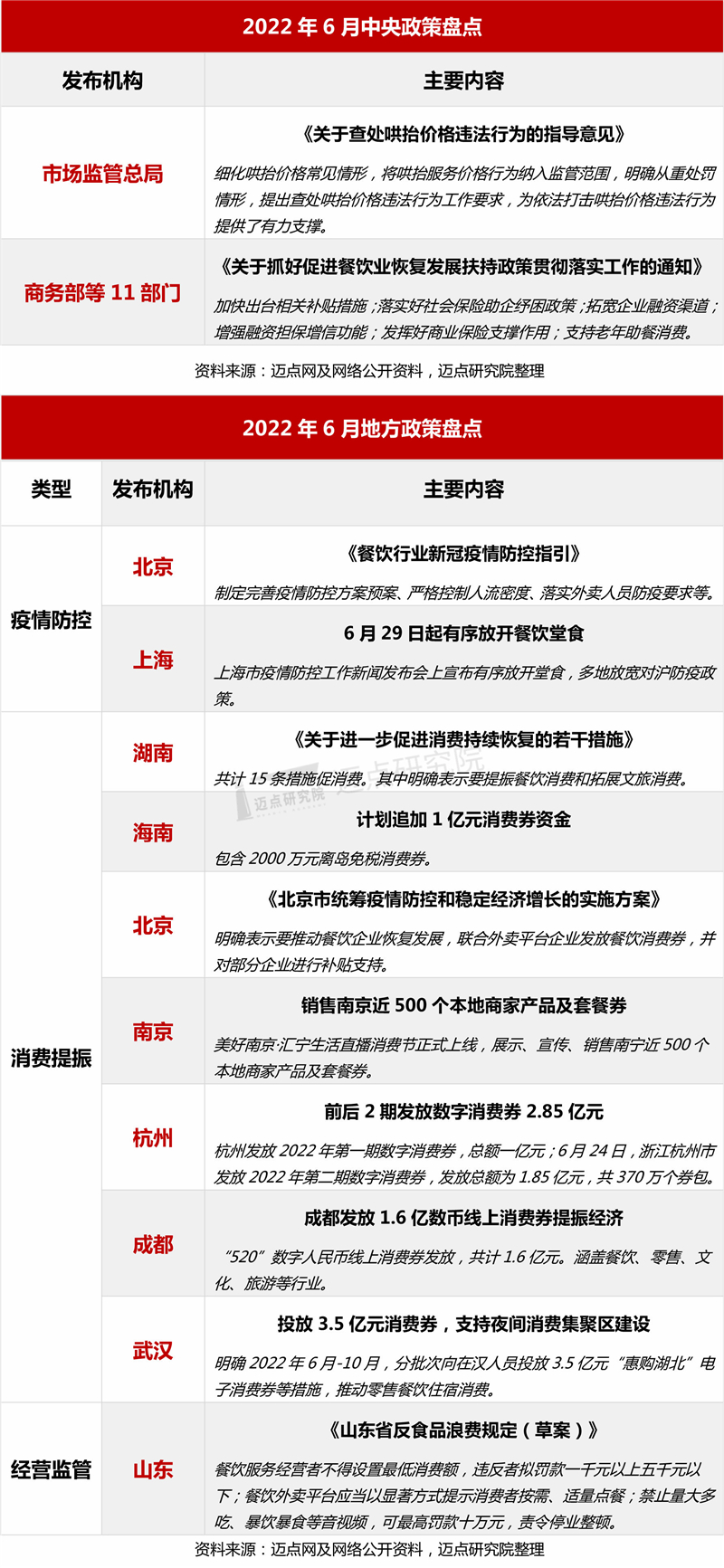 今年年初,国家发展改革委等多部门出台《关于促进服务业领域困难行业恢复发展的若干政策》,提出43条精准帮扶措施。国务院5月份印发《扎实稳住经济的一揽子政策措施》,部署对文化旅游、餐饮住宿等困难行业给予更大力度支持。全国包括北京、上海、广东、江苏、浙江、四川等地积极响应,出台一揽子政策提振经济。6月,商务部等11部门印发《关于抓好促进餐饮业恢复发展扶持政策贯彻落实工作的通知》,明确要求从六个方面促进餐饮业恢复发展,在中央层面对服务业助企纾困给出了更加明确的信号。