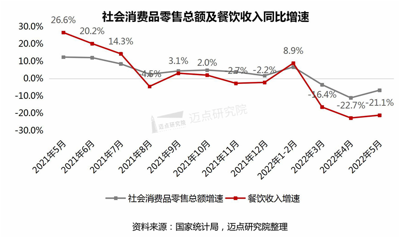 2022年1-5月,餐饮收入16274亿元,同比下降8.5%;限额以上餐饮收入3906亿元,同比下降9.1%。其中,5月份,餐饮收入3012亿元,同比下降21.1%;虽遇小长假,稍有改善,但仍较弱。限额以上餐饮收入786亿元,同比下降20.8%。环比增长0.05%。自2021年下半年开始,我国社会消费品零售总额同比增速明显放缓。尤其餐饮业,叠加了人员流动受限的影响,多个月份呈现出负增长。不过,随着国内旅游市场全面重启,有望带动餐饮市场进一步复苏回暖,同时也给餐饮企业的防疫工作提出了更高的要求。