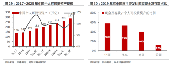 根据奥纬咨询的数据,2019 年我国个人可投资资产规模达到 160 万亿,同比增长 11%,预计到2025 年将以 10%的复合增速稳步增长。但结构上,2019年现金及个人存款占比较大达到 58%,而对比发达国家,美国现金占比仅为12%。预计到 2025 年,现金+存款的比例将下降至 43%,基金+定期投资+股票类投资比例将提升至 49%,居民资产入市将支撑资本市场迎来长期繁荣。