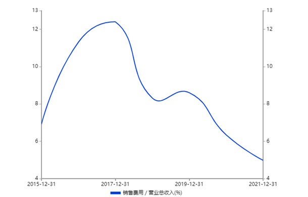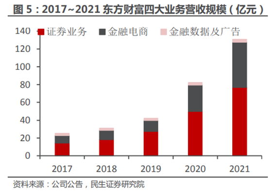 基于用户规模的优势,东方财富的证券业务保持高速增长,2021年证券业务占比59%,主要为C端经纪业务和两融利息收入,而2021年的销售费用率仅为4.98%,近5年呈整体下滑趋势。其他非互联网券商的销售费用率要高得多,2021年券商销售费用率中位数为43.20%。
