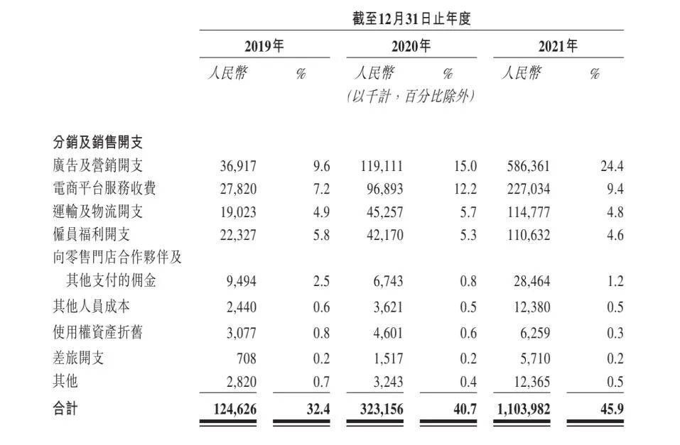 蕉下的招股书中显示,2019至2021年度,蕉下公司分别在科技研发上分别支出1990万元、3590万元和7160万元,占比为5.3%、4.6%和3%,呈逐年下降趋势。其中2021年,蕉下公司在研究和开发上的花费仅为其营销成本的12.21%。