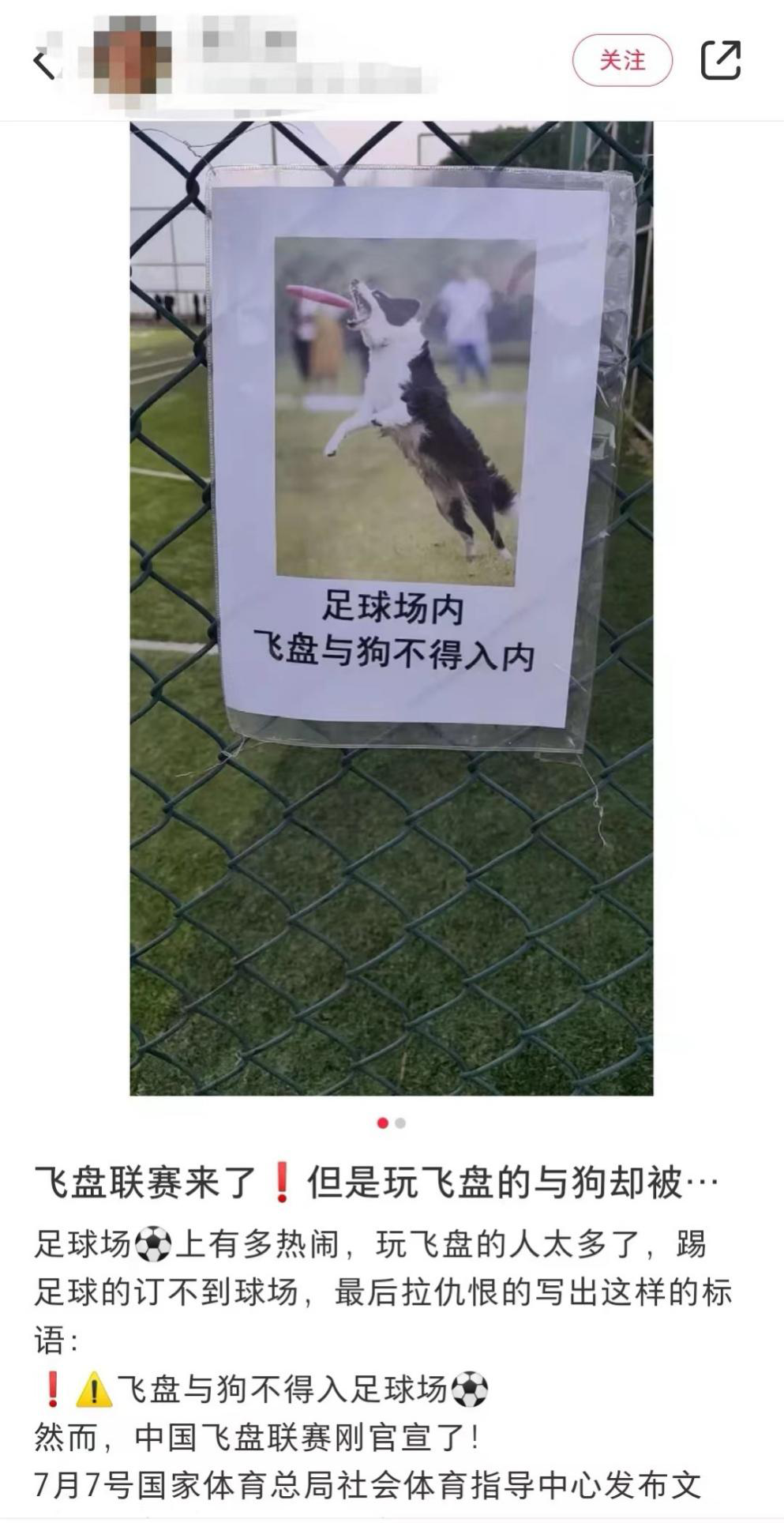 7月初,小钰看到一张小红书的截图在飞盘群里流传。图片里,一张贴在足球场防护网上的A4纸上面写道,“足球场内飞盘与狗不得入内”。这张图引起了很多“盘友”的不满。