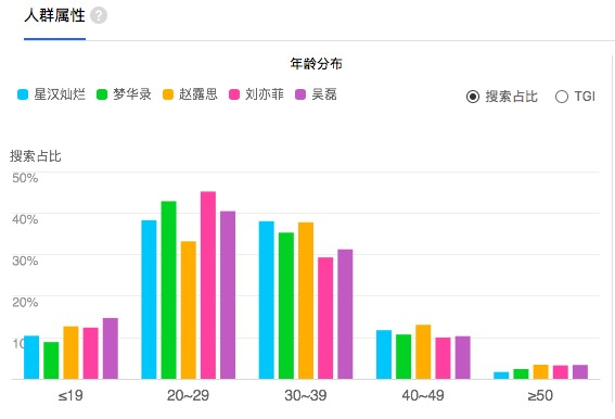 娱乐独角兽查询百度指数发现,吴磊、赵露思、《星汉灿烂》关键词的搜索占比在19岁以下、30-39岁年龄段确实要高于刘亦菲、《梦华录》,但主要用户群同样集中在20-39岁。换言之,上述说法虽有其可信之处,但也缺少站得住脚的论据。