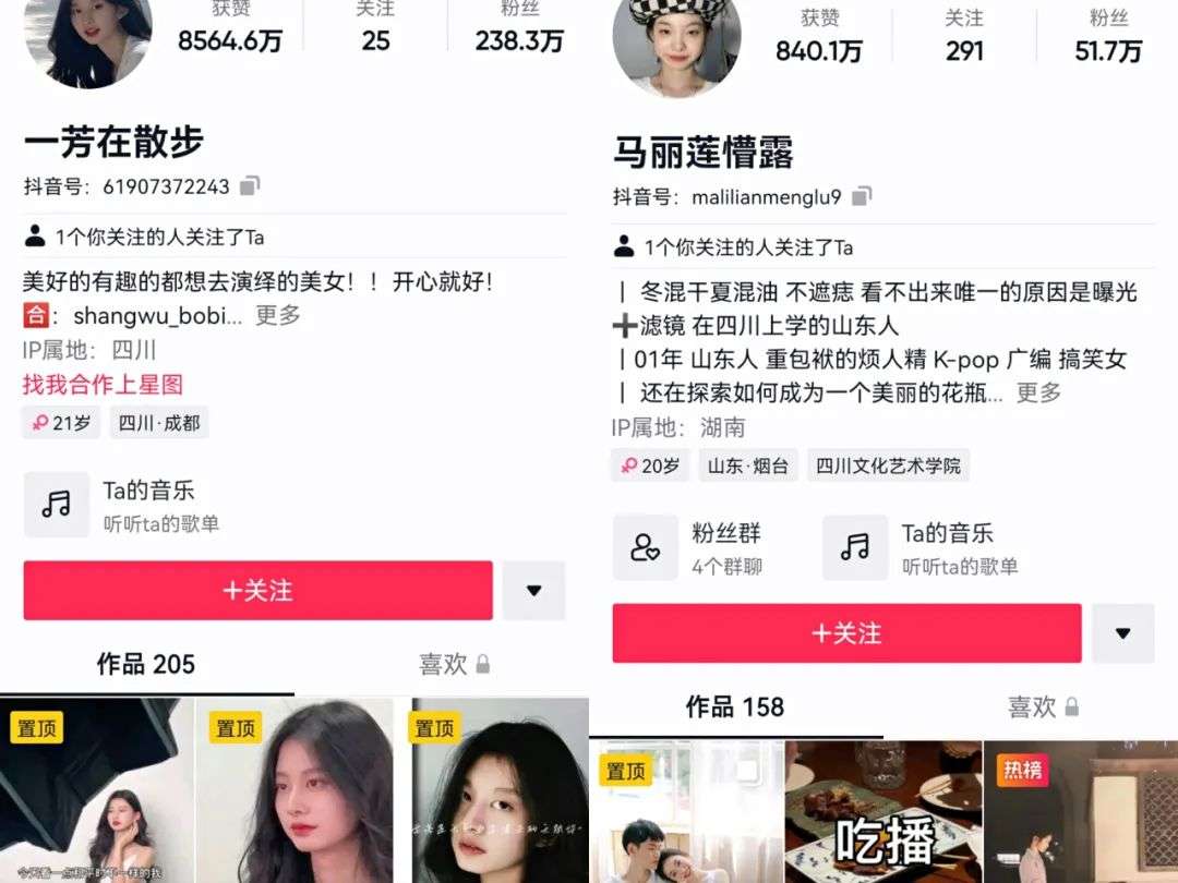 在这种情况下,也有不少“盗版”反倒成功转型,实现了个人IP的转正。比如近期因酷似刘浩存走红的博主“马丽莲懵露”,起初便在网友对刘浩存的抵制下,因长相被捧为“刘浩存代餐”,接受着针对于刘浩存的两极化评论输出。在热度退却后,其也在逐步完成细分赛道的流量转化,成功实现了美妆博主与恋爱博主的转型,目前拥有50多万粉丝。
