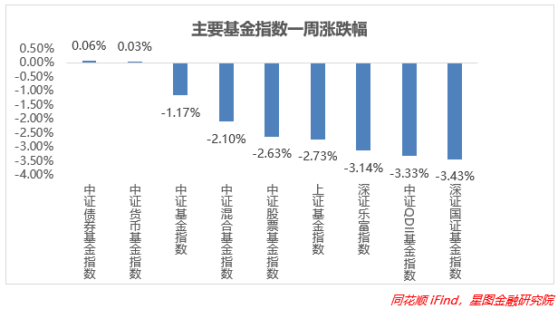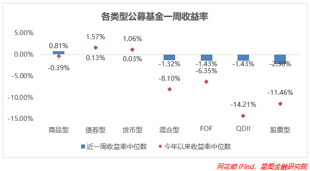 上周商品型基金一改7月以来的跌势,同债券型、货币型基金维持涨势,混合型、FOF、QDII型基金跌幅在1.5%以内,股票型基金受到上周国内股市行情影响,由涨转跌,且跌幅超过2%。