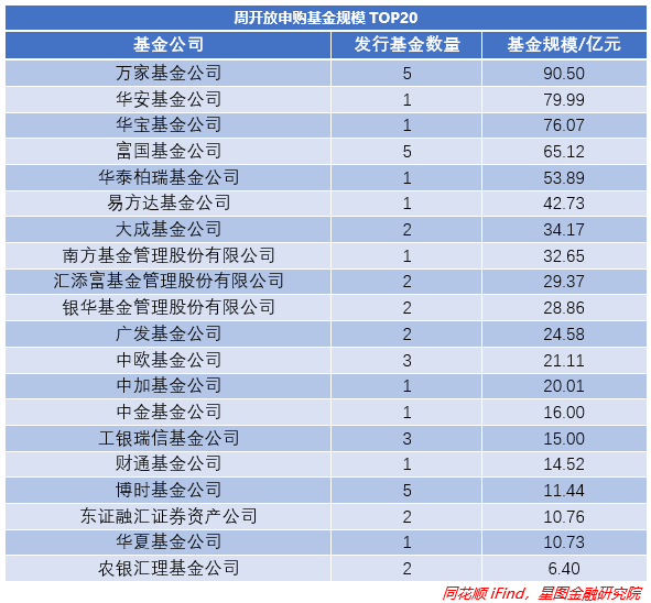 上周股票型基金平均仓位81.27%,偏股混合型基金平均仓位74.30%,周环比均有所下降。共开放申购基金48只,其中股票型基金3只,混合型28只,债券型10只,FOF型4只,货币型1只,QDII型2只,数量周环比大幅下降,可能与市场不振有关。上周无申购破百亿的公司,万家基金开放申购基金数量和规模均最多,华安基金、华宝基金随后分列二、三位,38家基金公司中有一半公司开放申购基金的规模在10亿元以下。