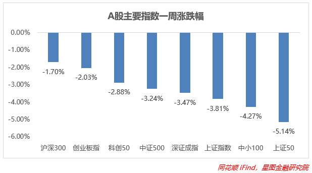 上周A股市场整体延续下跌趋势,大盘进一步下探至3230点附近,接连向下突破5日、10日、20日、30日线,周五盘中略有反弹但下午震荡走弱。从指数层面看,上周各个主要指数均跌势不减,且跌幅较上期相比有所扩大,其中上证50跌幅依旧最大,为5.14%,中小100跌幅次之,为4.27%,沪深300跌幅最小但也超过1.5%,其余指数等均有不同幅度的下跌。