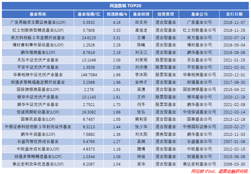 上周基金涨跌幅TOP20中FOF型基金下跌数量最多。股票型基金中科技、电子、制造板块占据主流,从风格上来看上周中大盘成长型基金收益涨幅居前列;债券型基金中领涨基金中小型基金和迷你基金数量差距不大;混合型基金依旧表现最好,新疆前海联合基金公司收益涨幅最高,也是唯一破10的基金公司;QDII基金涨幅分化严重,货币型基金、商品型基金表现同之前相近。