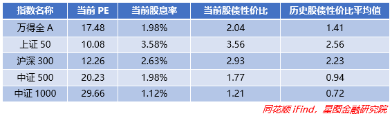 从股债性价比来看,目前万得全A市盈率倒数与十年期国债的比值为2.04,而历史均值为1.41,处于绝对的高位,历史分位值位置处于88.43%(即性价比高于88.43%的时间),上证50、沪深300、中证500和中证1000的股债性价比历史分位值分别处于90.25%、90.74%、95.95%和92.47%,说明目前股价性价比高,可以适当投资股市。